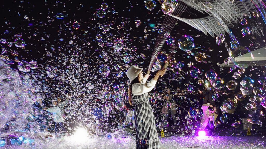 夕方からは、地元伊予市を拠点に活動されているシャボン玉グループ「OCEAN Bubble STARS」様による「シャボン玉ショー」。夕暮れや夜景をバッグに伊予灘サービスエリアが幻想的な空間となり、お子様からご年配の方まで多くの方にお楽しみいただきました。