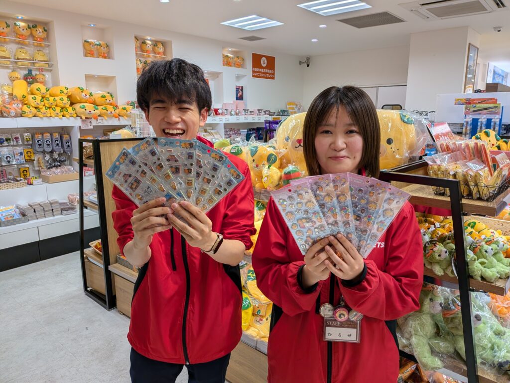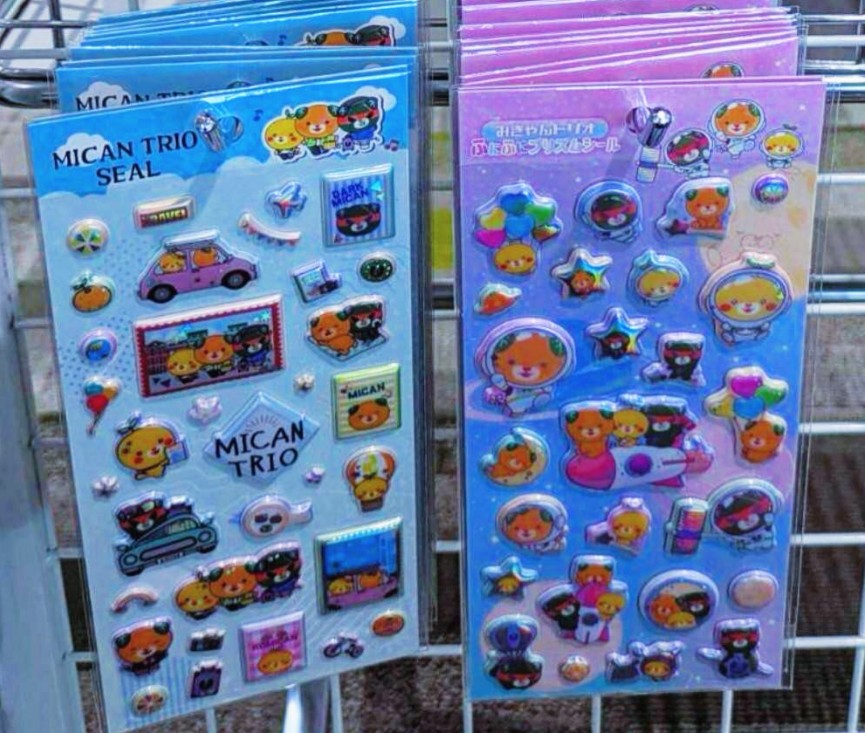 ご当地キャラクター「みきゃん」が印字されたシールは愛らしく、旅の思い出づくりやお土産として大人気🍊