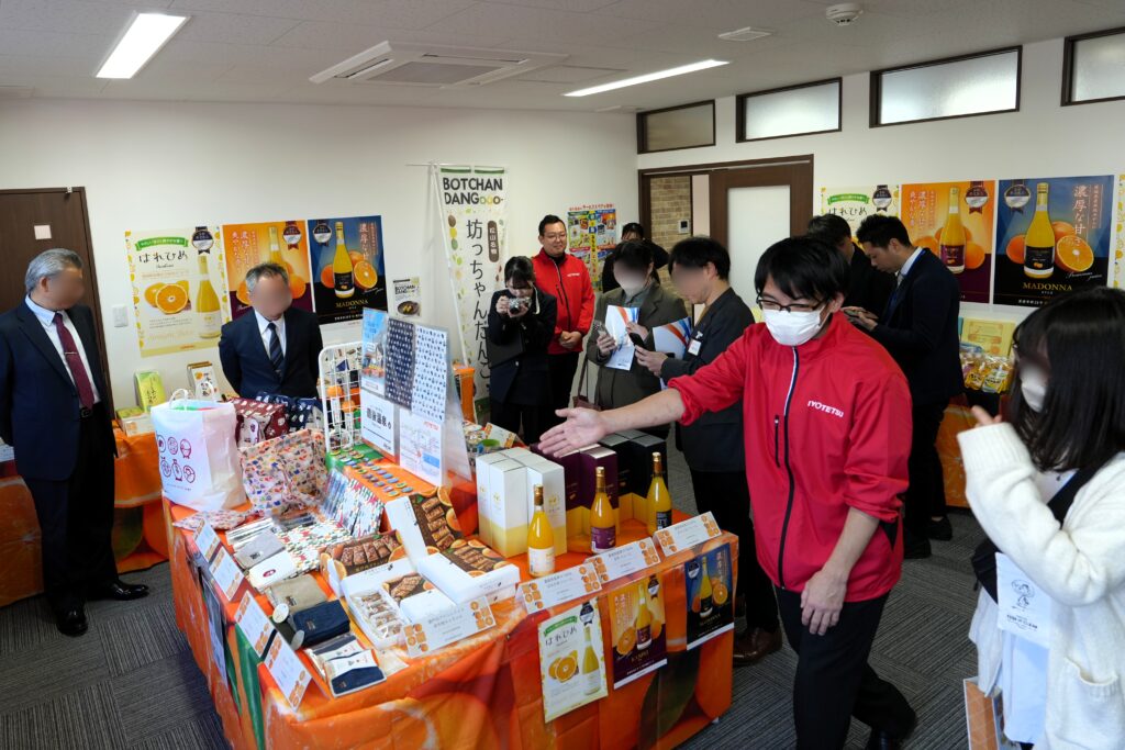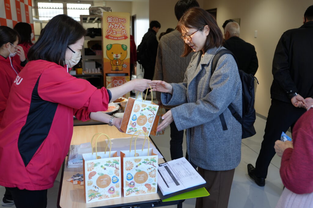 見学会では、記念品の配布や自社オリジナル商品の展示と試食、蛇口みかんジュースの試飲など地域の皆さまにも楽しくご参加いただける催しを多く設けました。当日は大変多くの方々にご覧いただき、新たな拠点のお披露目を通じて、地域とのつながりを実感できる機会となりました。